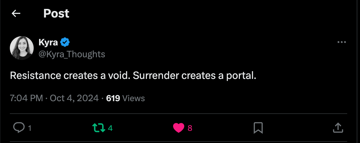 Prayer invokes a sense of deep connection with others, and is a way to access both silence and surrender. Surrender means accepting that you are in the ocean, that you do not, that you should not have domain over the currents. Surrender means letting go of our misaligned need to control things. When we stop fighting against the currents of reality, we will often be surprised and delighted to find ourselves ending up exactly where we were meant to.